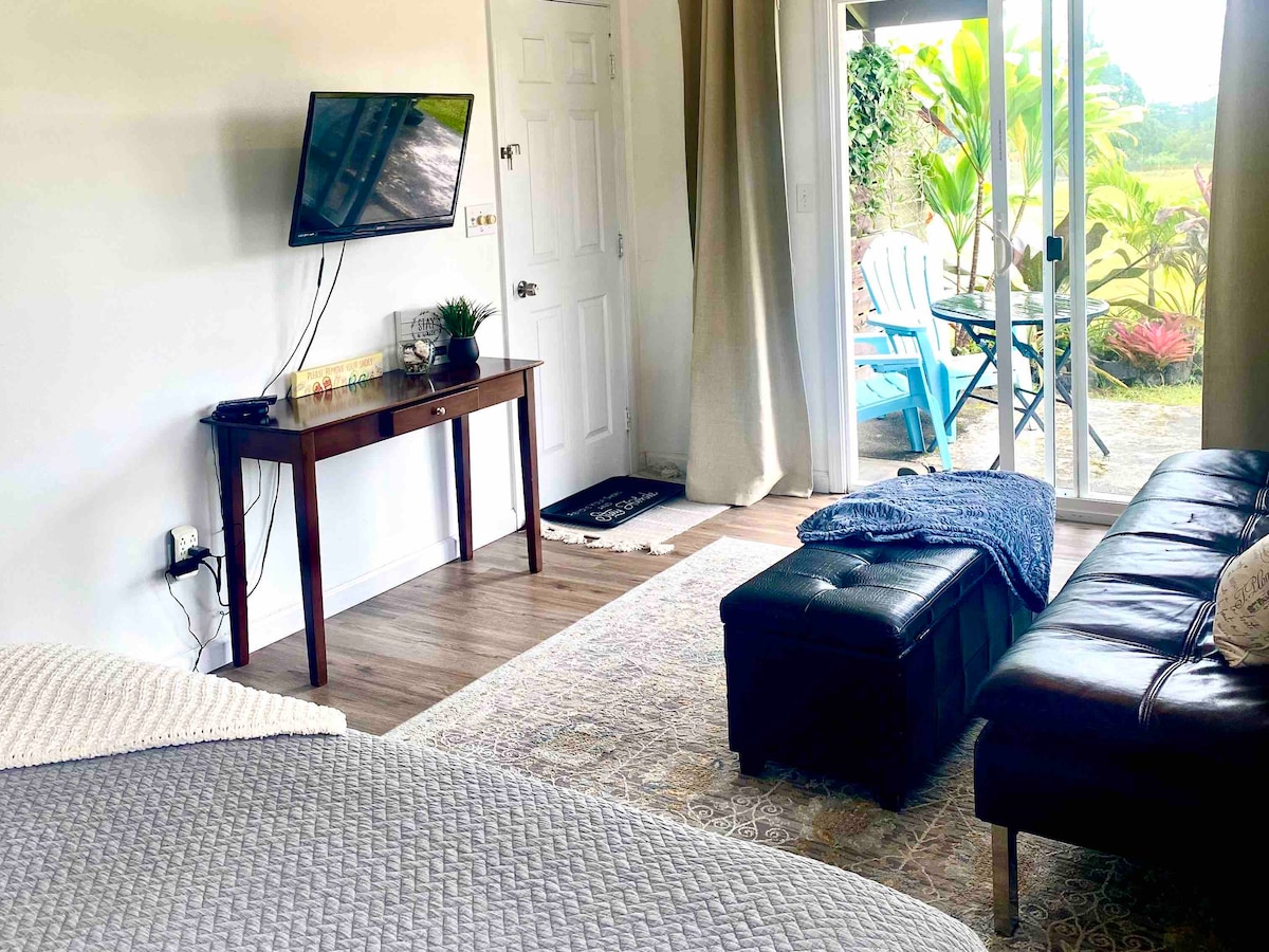 Please come and enjoy our quiet, clean, first floor unit. Sit and relax on the covered lanai, or enjoy a glass of wine by the fire. Listen while the coquis lull you to sleep at night and gently awaken to the cacophony of tropical birds in the morning. The downstairs unit at J&R's Banana Cabana offers a comfortable queen sized bed, kitchenette with microwave and refrigerator, and a full private bathroom. Come stay, enjoy, and relax!