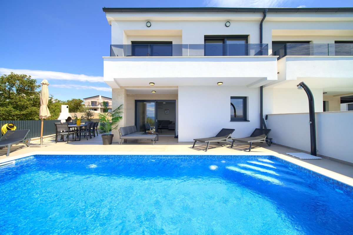 This modern two-story villa offers a private pool and three beautifully appointed bedrooms, each with its own en-suite bathroom. Guests can enjoy a fully equipped kitchen, a private sauna, and a spacious terrace featuring a fireplace and an outdoor dining area surrounded by the greenery. Nestled in a peaceful setting just 3 km from the center of Malinska and its beaches, the villa combines authentic charm with comfort, privacy, and effortless relaxation.