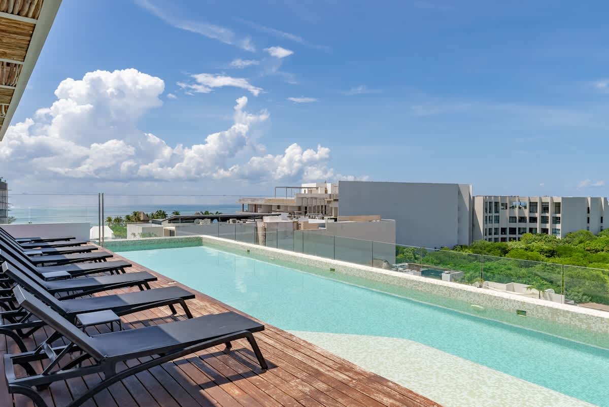 😎 Beautiful panoramic ocean views from one of the most stunning rooftop pools in Playa del Carmen where the ocean is only steps away from the location. Spend endless hours soaking up the sun while gazing out into the turquoise blue. We also have a fitness center with great views of the ocean which you will enjoy while working out. cuna y silla de bebe esta sujeto a disponibilidad 🌊