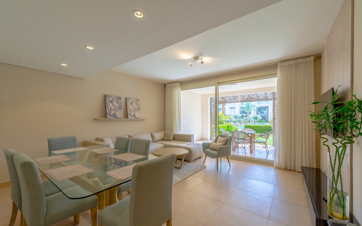 This stylish 1-bedroom ground floor in Mangroovy, El Gouna’s only sea-front residence, is situated in M9 cluster, the closest cluster to the beach. It features a large terrace just steps away from a large swimming pool and is a 2-minute walk to the beach, offering 24-hour free access to both the pool and the beach. The famous marinas are also within walking distance. A supermarket, pharmacy, café, laundry, beauty salon, and a food restaurant are all conveniently located within the residence.
