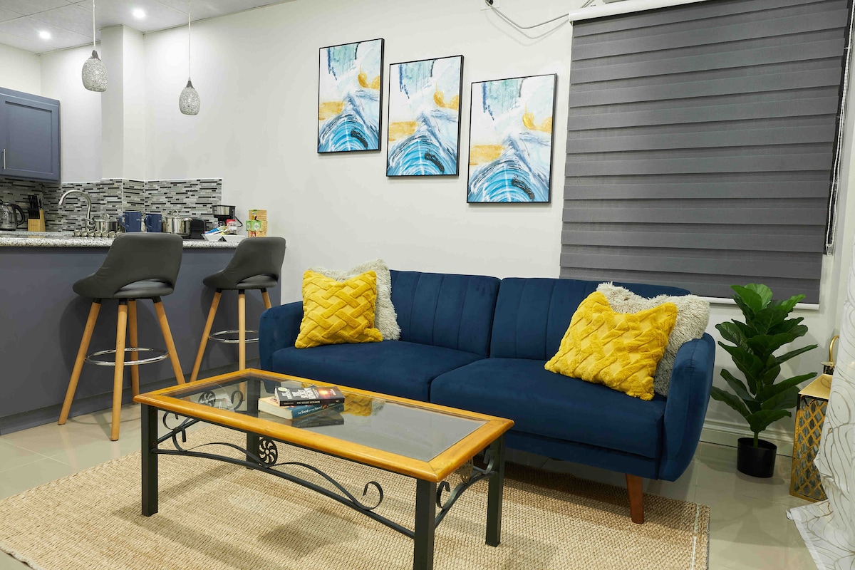 The Apartment is about a 6 minute drive to the Airport The unit includes - Electric kettle Toaster Pots and Pans,Dishes and Utensils Sandwich maker 1 queen size bed Sofabed 1 bathroom Walk-in Closet Parking for one vehicle AC Electronic gate Security Cameras Wifi H/C water TV Stove Fridge Microwave Washer and dryer Situated in a quiet neighborhood,close to supermarkets, gas station, pharmacy, fast food outlets,restaurants, schools, pubs, malls, bird sanctuary, etc. *No smoking