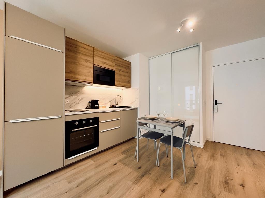 35m2의 밝은 전체 숙소는 완전히 안전한 고급 신축 건물(건물 내 비디오 감시)에 위치한 호텔 스타일의 코코닝입니다. 완전히 새로운 숙소로, 소파 베드(2인 이상 추가), TV, 와이파이, 주방 시설(콘로, 오븐, 전자레인지, 냉장고, 냉동고, 식기 포함), 네스프레소를 갖추고 있습니다. 새로 단장한 욕실에는 장애인 기준에 맞는 큰 샤워실이 있습니다. 객실에는 2인용 140x200 편안한 침대가 있습니다.