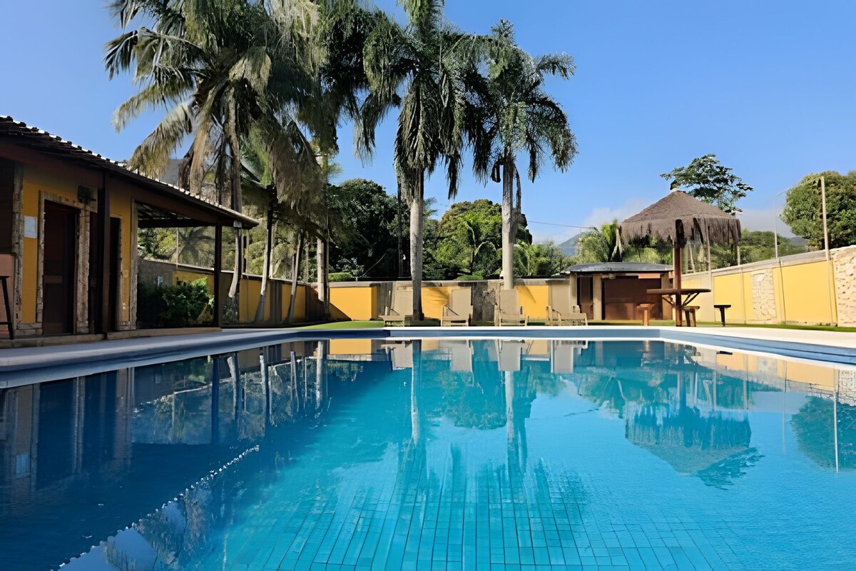 Relaxe em nossa ampla piscina cristalina e celebre momentos na área gourmet completa, o ponto alto da casa! Um espaço de 1000m² com decoração sofisticada, cercado de natureza e com vista para a montanha. Tenha dias de lazer e paz, com total privacidade e fácil acesso ao centro (6 min) e à praia (7 min). O refúgio perfeito espera por você.
