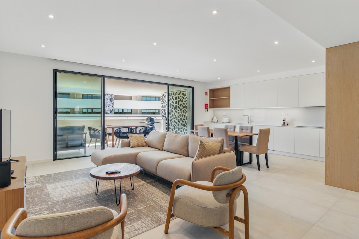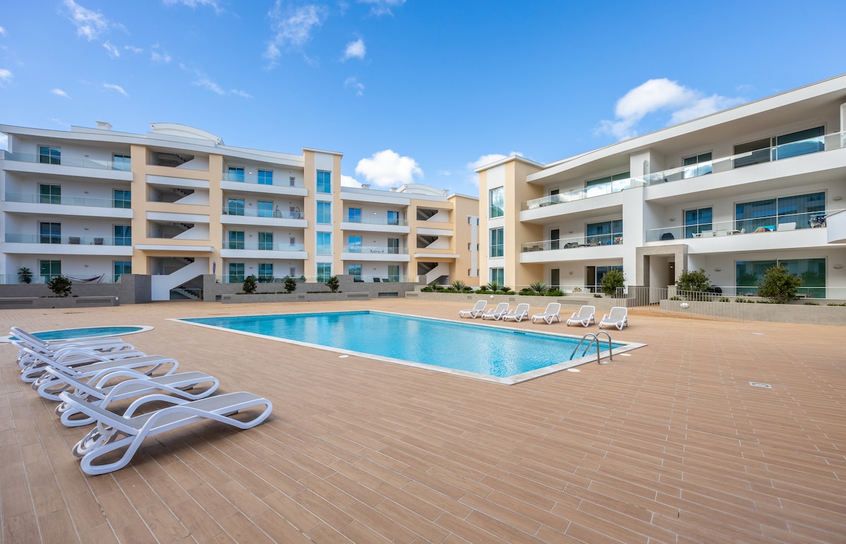 T3 modern apartment with large balcony and panoramic views over Lagos bay, in gated community with 2 outdoor pools and 1 indoor heated swimming pool, sauna, Turkish bath, gym, in door play ground to children's, with spacious living room and kitchen full equipped, 3 bedrooms, 2 bathrooms, air conditioning & inside box parking includes a barbecue