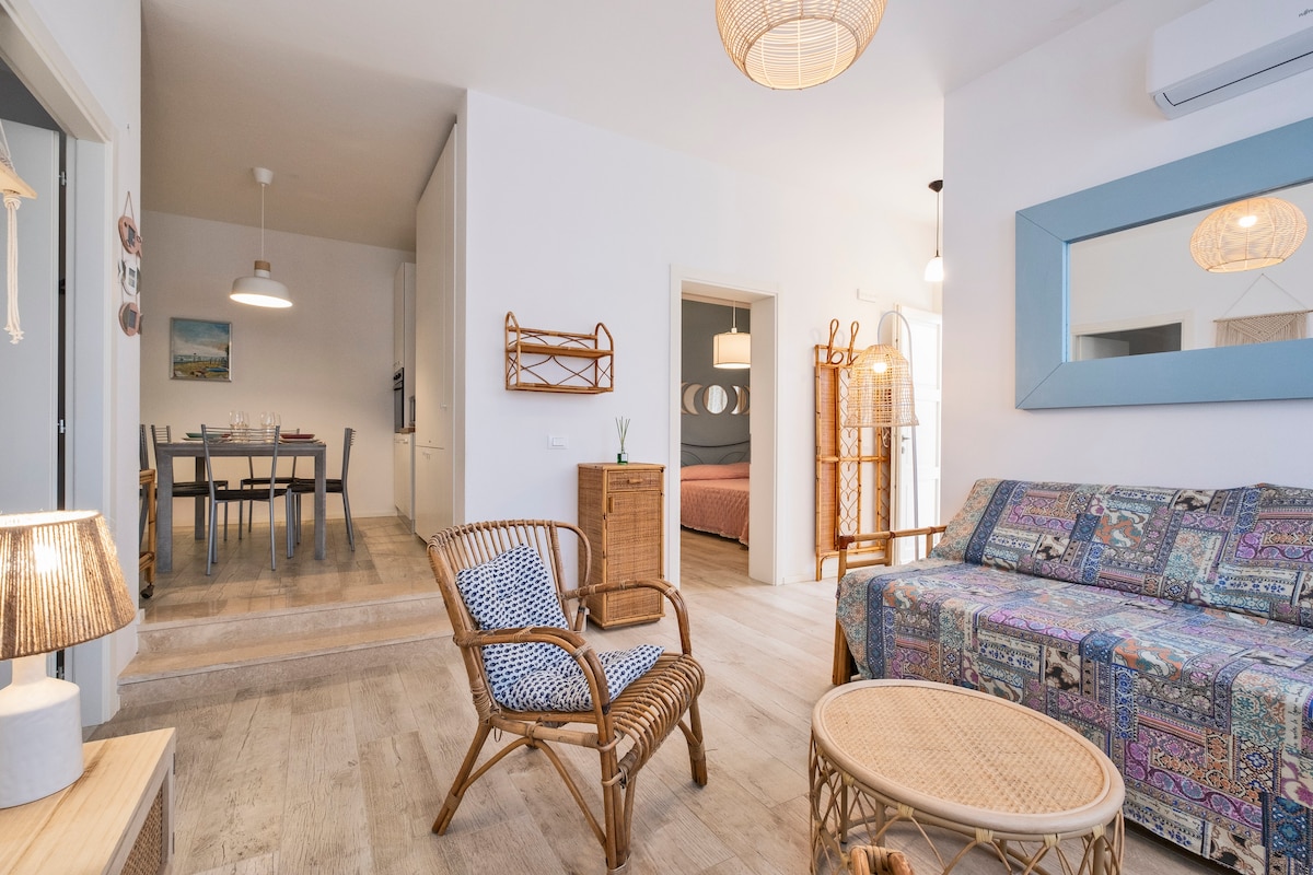 해변에 위치한 98평방미터 규모의 아파트로 상점이 있는 보행자 도로에서 200미터 거리에 있습니다. 숙소에서 도보로 2분 거리에 있는 전용 차고(1박당 12유로) 숙소 시설: - 대형 소파와 55인치 스마트 TV가 있는 대형 거실 - 아름답고 밝은 주방/식사 공간 - 침실 2개 욕실 -2개 -야외 석조 테이블과 철제 의자가 있는 테라스 1개, 바다 전망