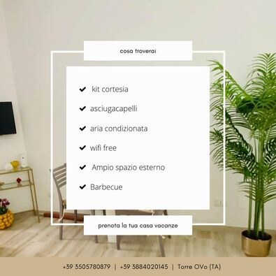 Holiday house in Torre Ovo, upper Salento 6 km from Campomarino di Maruggio (Blue Flag 2019 awarded by the Fee - Foundation for Environmental Education) 150 meters from the beach with a bike path that runs along the beautiful coastline and the playground overlooking the sea. The house is equipped with all comforts: parking space, mosquito nets, garden where you can have lunch/dinner, equipped kitchen, air conditioning, TV, covered terrace overlooking the sea with barbecue and wooden table.