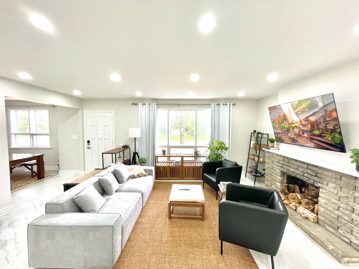 완전히 개조된, 현대적이고 밝고 고급스럽고 넓은(1800평방피트 이상) 2베드룸, 2욕실 높은 천장 지상 아파트, 별도의 출입구, 파티오를 갖춘 내 집처럼 편안한 숙소입니다! 에어비앤비에서 별 5개 평점을 받은 상위 5% 숙소! GTA의 중심지에 위치하고 있습니다. 피어슨 공항, 고속도로 401/404/407, 쇼핑몰, 식료품점, 트렌디한 레스토랑, 영화관, 공원, 자전거/하이킹 트레일 등이 가까이에 있습니다. 자신있게 예약하세요!