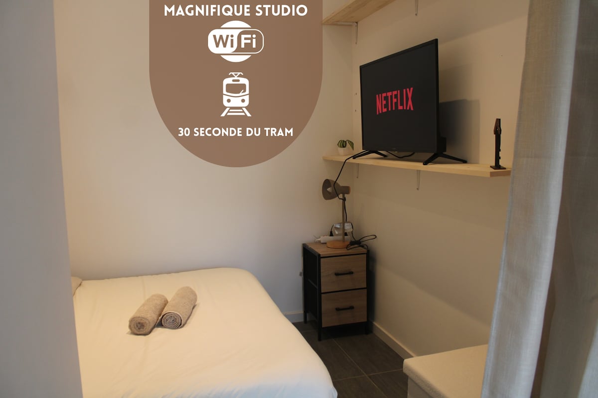 Situation du studio: Superbe studio de 35 m² situé au rez-de-chaussée. Ideal pour vos missions, stages, visites familiales,escale,séminaires. A dix minutes du tram way Valenciennes . Proches des axes autoroutiers Paris-Bruxelles ,Valenciennes-Cambrai ,Lille-Saint Amand. A deux minutes du centre ville, Basic fit,du cinéma, du centre aquatique, commerces. Un accès autonome grâce à une boîte à clés ,un parking gratuit attenant .