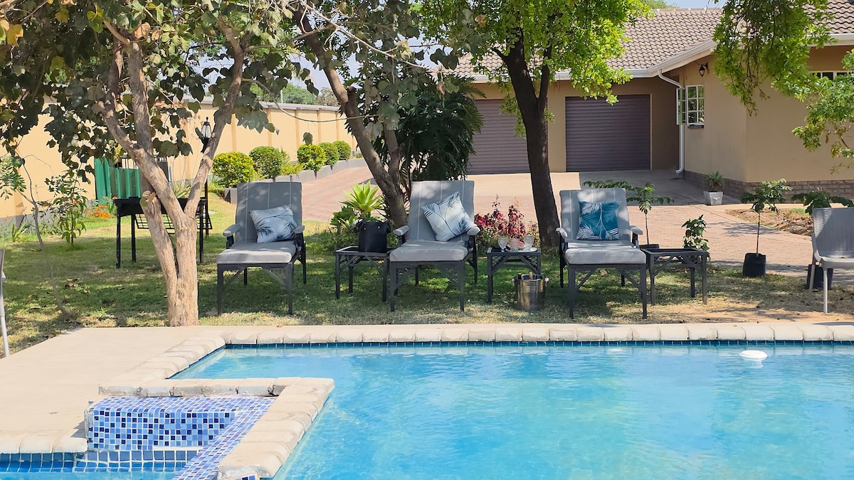 편안한 휴가, 출장 또는 루라 행사에 적합한 세련된 4베드룸 주택입니다. 프로스펙트의 푸르른 교외에 자리 잡고 있으며, 폭포가 있습니다. 하라레 국제공항에서 차로 10분, 하라레 CBD에서 차로 15분 거리에 있습니다. 럭셔리한 수영장, 정자, 브라아이 공간을 갖추고 있어 편안함과 신뢰성을 위해 설계되었습니다. 천공수와 대형 태양광 발전 백업으로 원활하고 중단 없는 숙박을 보장합니다. 게스트는 무제한 와이파이를 즐길 수 있으며, 전기 울타리가 완비된 숙소에서 안심하고 지낼 수 있습니다.