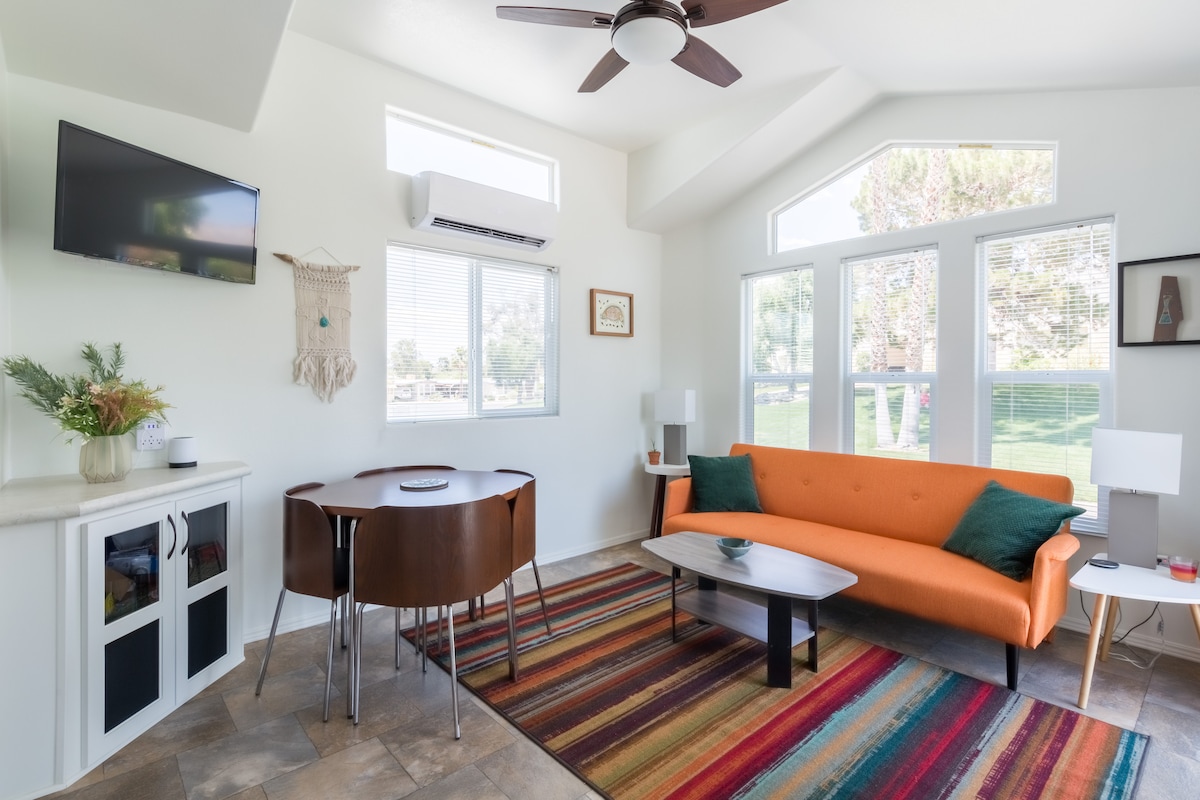 This tiny house is not so tiny at 600 sq. ft. Light-filled and mid-century modern-appointed in a gorgeous hot springs retreat, situated on a lake and right across from the mineral pools. There are wonderful views of the sunrise over the mountains behind the lake, while egrets emerge and ducks stir from sleep and the black swan settles into his place under the oak tree. The desert wakes up and is bathed in sunlight while you enjoy a morning coffee on the patio before your first hot pool dip.