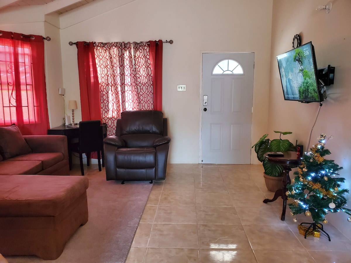 This newly renovated, fully furnished, one-bedroom apartment offers a serene and sophisticated ambiance in a beautifully decorated semi-attached unit. Amenities include a/c unit, water heater, and an indoor laundry room. The property features a spacious backyard within the secure, gated community of Holland Estates, providing a peaceful outdoor retreat and 24-hour security. Its convenient location offers 5 to 10 minute access to the Martha Brae River, Luminous Lagoon, and Falmouth Pier.
