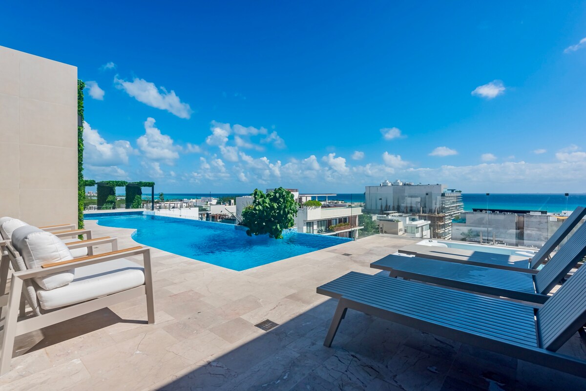 Wake up to a Priceless Caribbean oceanfront view. Enjoy your own plunge pool in terrace. Head downstairs for beach access. Walk everywhere…distance to the 5th ave and many other shopping & dining options. Gourmet restaurant in building & rooftop infinity pool. Gym Este lugar tiene una ubicación estratégica: ¡será muy fácil planear tu visita! estrategicamente ubicado frente al mar con los mas famosos clubs de playa justo al lado, area vibrante y a cinco minutos caminando de la quinta ave