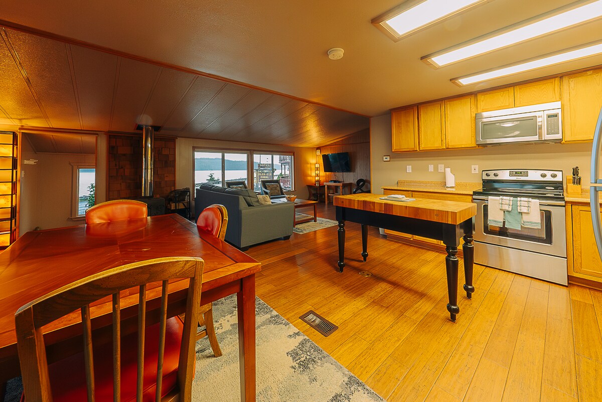 Enjoy the view of the Hood Canal through the front room windows or while relaxing on the porch. Fully furnished, with dining/living areas, 2 bedrooms with queen beds, 1.5 baths and a full kitchen with all the essentials. The living area has a sofa sleeper with full-size mattress. Additional amenities include a cozy wood stove, cable TV/DVD player, and a small back porch with a propane fireplace and sitting area. We have hotel rooms at next door for additional guests