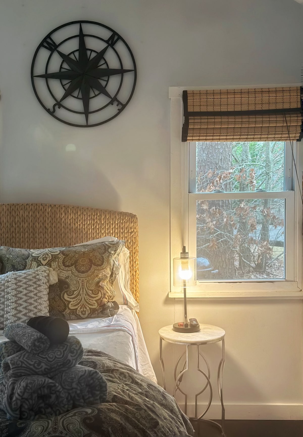 Our home is located on a wooded lot overlooking a pristine kettle pond. Access to our home requires ascending a long but gradual set of stairs followed by a second set of stairs to the entrance of the guest suite. The two room suite has a bedroom and a kitchenette with a microwave, toaster, electric kettle and mini frig. There is a French press, coffee bean grinder, tea, cups, dishes and flatware in the cupboards. It does not have a full kitchen ( no stove/ no kitchen sink)