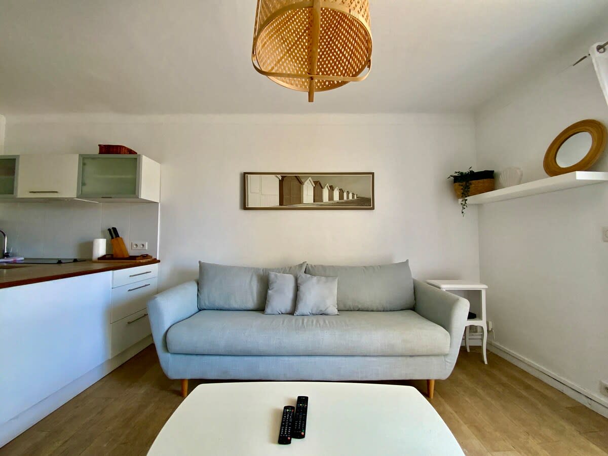 Studio 2 pers parking privatif, au calme, au pied des plages, plein sud, avec vue sur espace vert et aperçu mer. Situé 1er étage sans ascenseur, non-fumeur, avec Wi-Fi Havre de paix à deux pas du centre-ville, Animaux non admis Couchage : 1 lit escamotable & 1 canapé Salle de bain avec WC À l’arrivée : machine à café Senseo, draps, serviettes et torchons fournis. Thalasso à 1 minute à pied (tarifs sur place) Logement à laisser propre et rangé, départ avant 11h. Machine à laver pour longs séjours