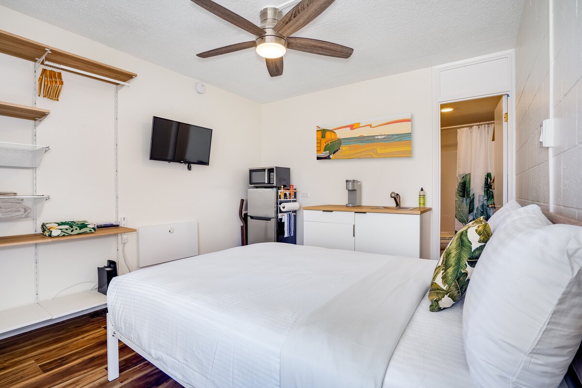 새로 업데이트되었습니다! 완비된 주방, 욕실, 풀사이즈 침대를 갖춘 와이키키의 완벽한 스튜디오 콘도입니다. 1인용(또는 서로를 정말 좋아한다면 2인용!)입니다. 해변/바다 전망을 감상할 수 있는 전용 베란다. 와이키키 중심지에 있는 유명한 와이키키 해변까지 몇 걸음 거리에 있습니다!