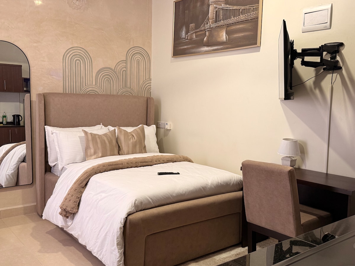 Welcome to one bedroom apartment with big space for your comfort,relaxation suitable for couples gatesway,working staff,travellers,diplomats,students,expatriates A full equiped kitchen,a living room,a modern bathroom,cozy beddings,coffee station,laundry area, The view of the garden with an outdoor sitting area makes the home more alive Its located in the prime area where you will have access to restaurants,coffee shops,nightlife,beachresorts,