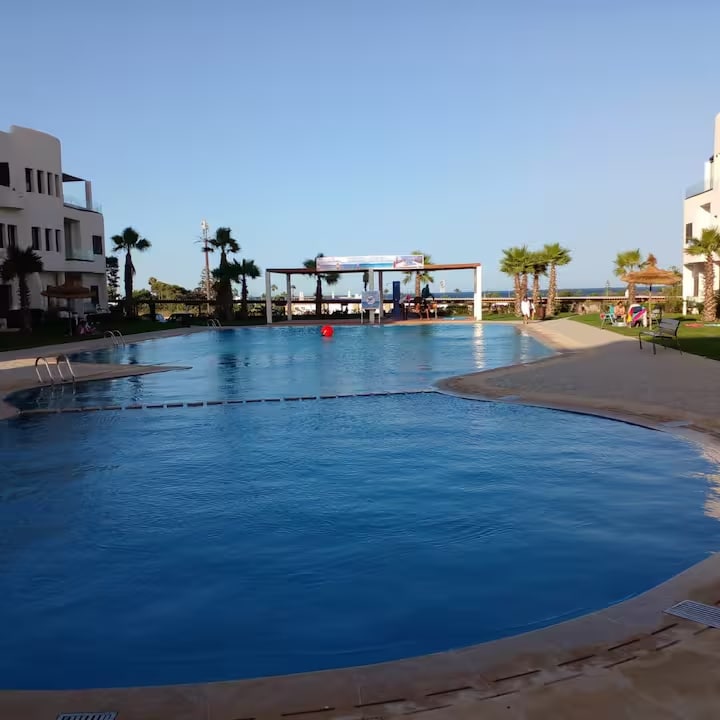 Amazing 3 bed apartment with all mod cons fully furnished with access to 7 great pools, outside gym, children's playing area, private parking 24hr security fully secluded, free wifi, this apartment comes with stunning mountain views, walking distance to the beach, this apartment is located in the north of Morocco.