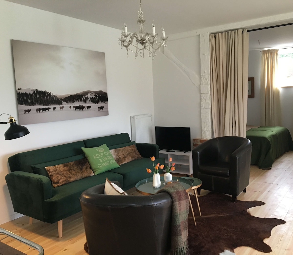 Auf unserem Hof findest du alles für ruhige Tage auf dem Land. Es gibt einen Bio-Dorfladen mit Café, eine Fasssauna und die Natur direkt vor der Tür. Viermal wöchentlich finden Yogakurse statt – ideal, um Körper und Geist zu stärken. Ein Parkplatz und eine E-Tankstelle sind vorhanden. Wir sind ein 4-Generationen-Hof mit nachhaltigen Projekten, darunter ein entstehender Permakulturgarten vor der Ferienwohnung. Die Wohnung ist ideal für Paare, ein Kinderbett stellen wir gern bereit.