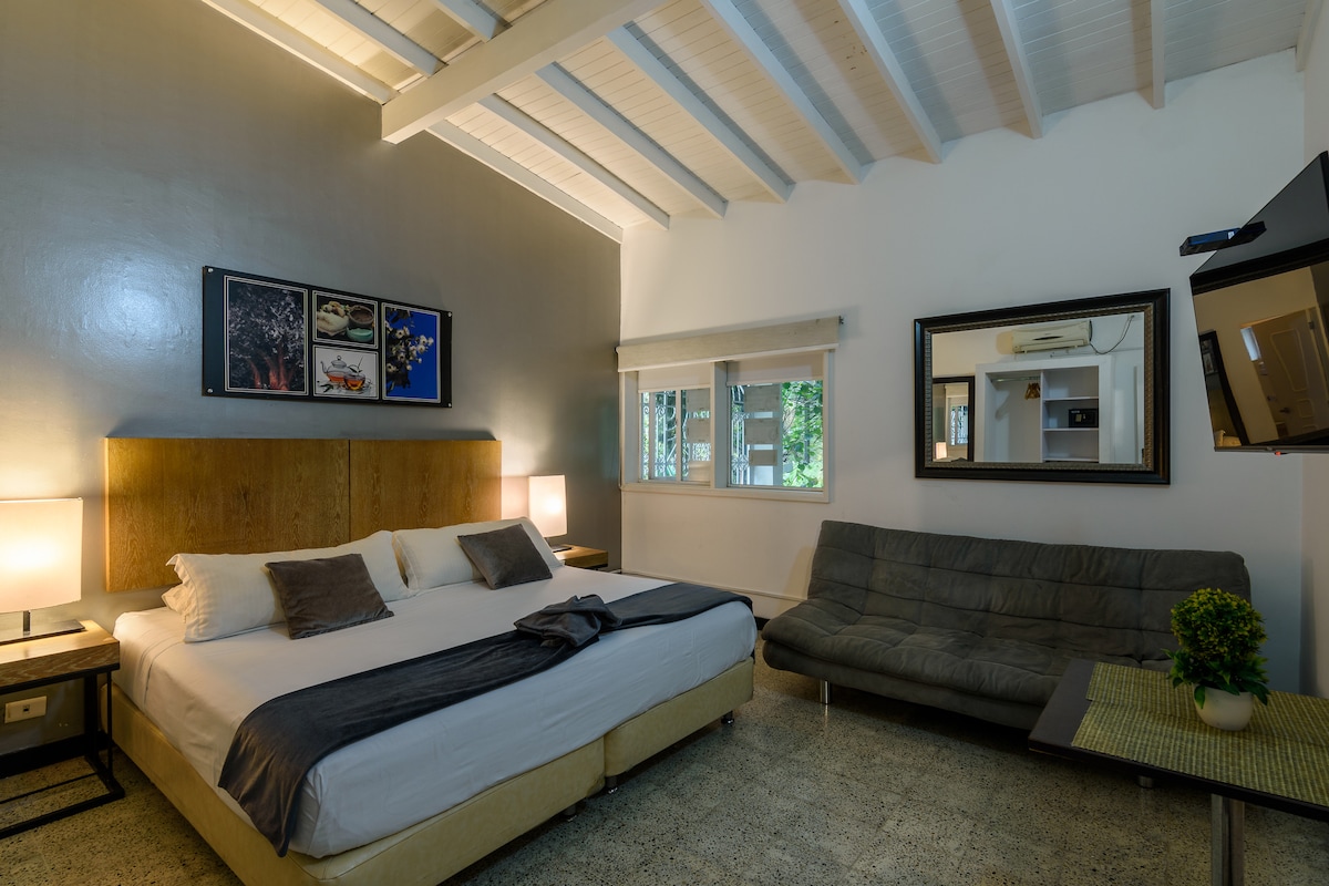 Habitación de 23 Mt2 con cama King, para 2 personas. Tiene aire acondicionado, secador de pelo, plancha, baño privado con ducha, pisos de madera, caja fuerte, wifi de cortesía y muchas más facilidades.