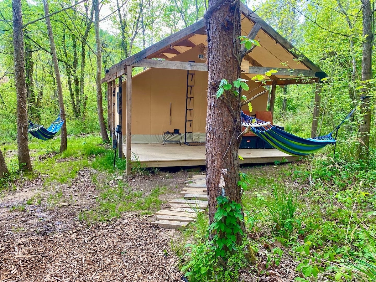 개구리가 노래하고 거북이가 돌아다니는 자연의 샘 근처에 자리한 아늑한 텐트 '프로그 송'을 만나보세요. 퀸사이즈 침대 2개, 에어컨, 난방, 전기, 와이파이, 네스프레소 머신, 미니 냉장고, 전자레인지, 페인트칠된 바위 프로젝트가 있습니다. 화덕, 숯 그릴을 즐기고, 온수 샤워기가 있는 전용 욕실까지 도보로 이동할 수 있습니다. 내추럴 브리지에서 몇 분 거리에 있는 평화로운 가족 휴양지에 완벽한 숙소입니다!