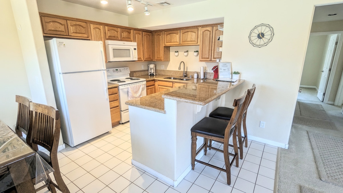 1층/서면 엔드 유닛, 공원 및 골프장 전망 킹사이즈 및 퀸사이즈 침대 에어컨 및 천장형 선풍기 4명이 편안하게 잘 수 있습니다. 각 침실 및 거실 공간에 TV 완비된 주방 무료 풀사이즈 세탁기/건조기 무료 와이파이 및 케이블 공용 수영장/온수 욕조/피트니스 센터/바비큐 파티오에 있는 전기 조지 포먼 그릴 울프 크리크 골프 코스에서 2분 거리 지붕 씌운 주차장 1개 + 게스트 주차 공간 단지 내 무료 RV/보트 주차 강아지 동반 가능, 환불되지 않는 반려동물 수수료 50달러(고양이는 동반 불가) 감사합니다. **이곳은 금연 숙소입니다**