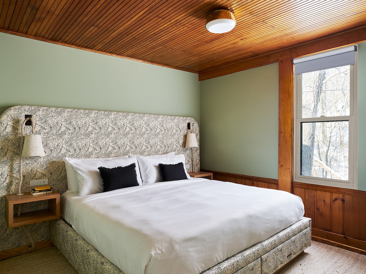 This airy space holds warmth in the details — wooden accents, walls the color of pine and sage, the faint smell of a campfire. One king bed features a cushy Casper mattress topped with plush Sferra linens. The bathroom, complete with Malin + Goetz bath products. A small but mighty kitchenette is home to your morning coffee thanks to a Moccamaster coffee machine, fridge + microwave. The dining table is your place to enjoy meals or gather for game night. the wifi and tv are also solid.