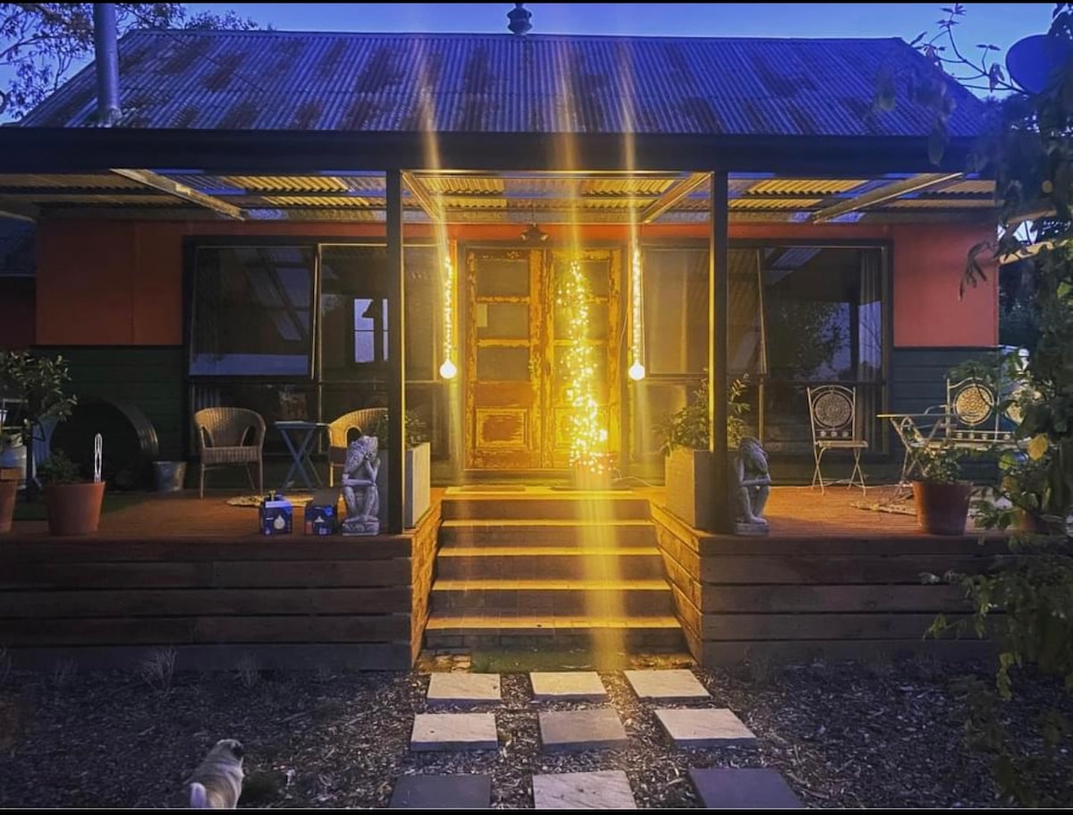 A charming country abode set among the stunning rural landscape between Orange and Molong, NSW. Comfortably furnished and featuring a cosy wood fire and two generous queen bedrooms. Relax outdoors in the luxurious outdoor bath, tasting some famous local wine. Or gather around the fire and take in the beautiful views and starry skies. Just 10 minutes to Molong or 20 mins to Orange with winery's and orchards along the way. A quiet country escape with action and experience on the doorstep.
