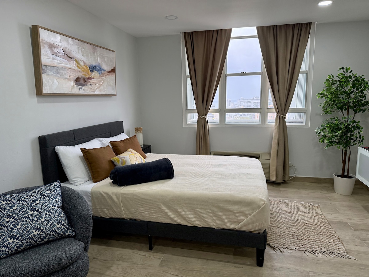 미라마르 컨벤션 센터 지구에 위치한 아늑하고 우아한 콘도 아파트로 올드 산후안, 콘다도 등 주요 관광지에서 몇 분 거리에 있으며 미라마르 센터의 레스토랑, 바, 아트 시네마 극장에서 도보 거리에 있습니다. 푸에르토리코 컨벤션 센터는 바로 건너편에 있습니다. 비에케스 및 쿨레브라 섬으로 가는 항공 서비스는 차로 단 3분 거리에 있는 이슬라 그란데 지역공항에서 이용할 수 있으며, 팬 아메리칸 부두까지의 거리도 같습니다.