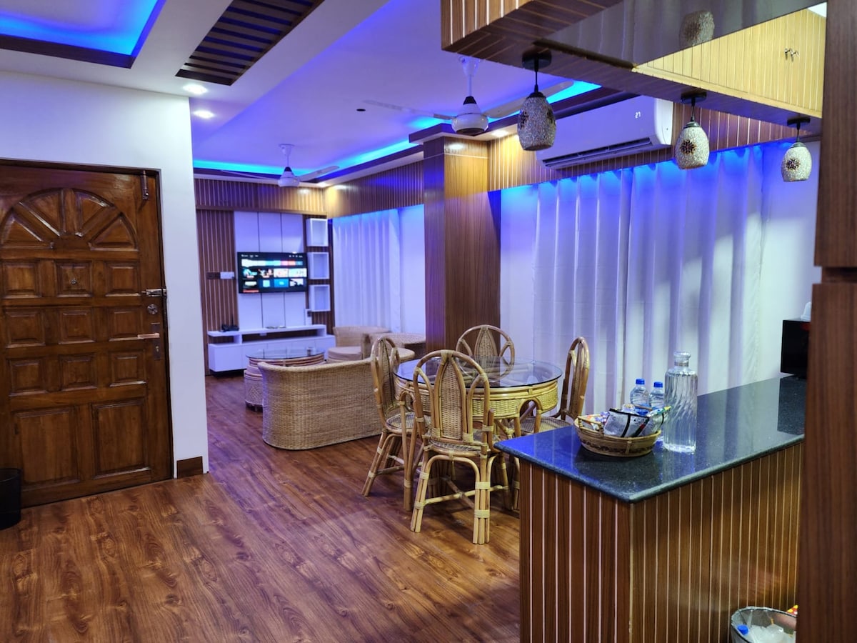 Reconnect with loved ones in this family-friendly place. close to airport and all amenities. Grocery, food chain shops are minutes away. Elegantly decorated with all house facilities. Separate Gym room with electric trade mill and other equipments. Exclusive library with huge collection of books. Three 55 inch TV, 6 AC, all Bathrooms with Geyeser, 6 battery IPS covering whole apartment in addition to generator. Floor ofvreal wood and spanish tiles. Expensive wooden furnitures.