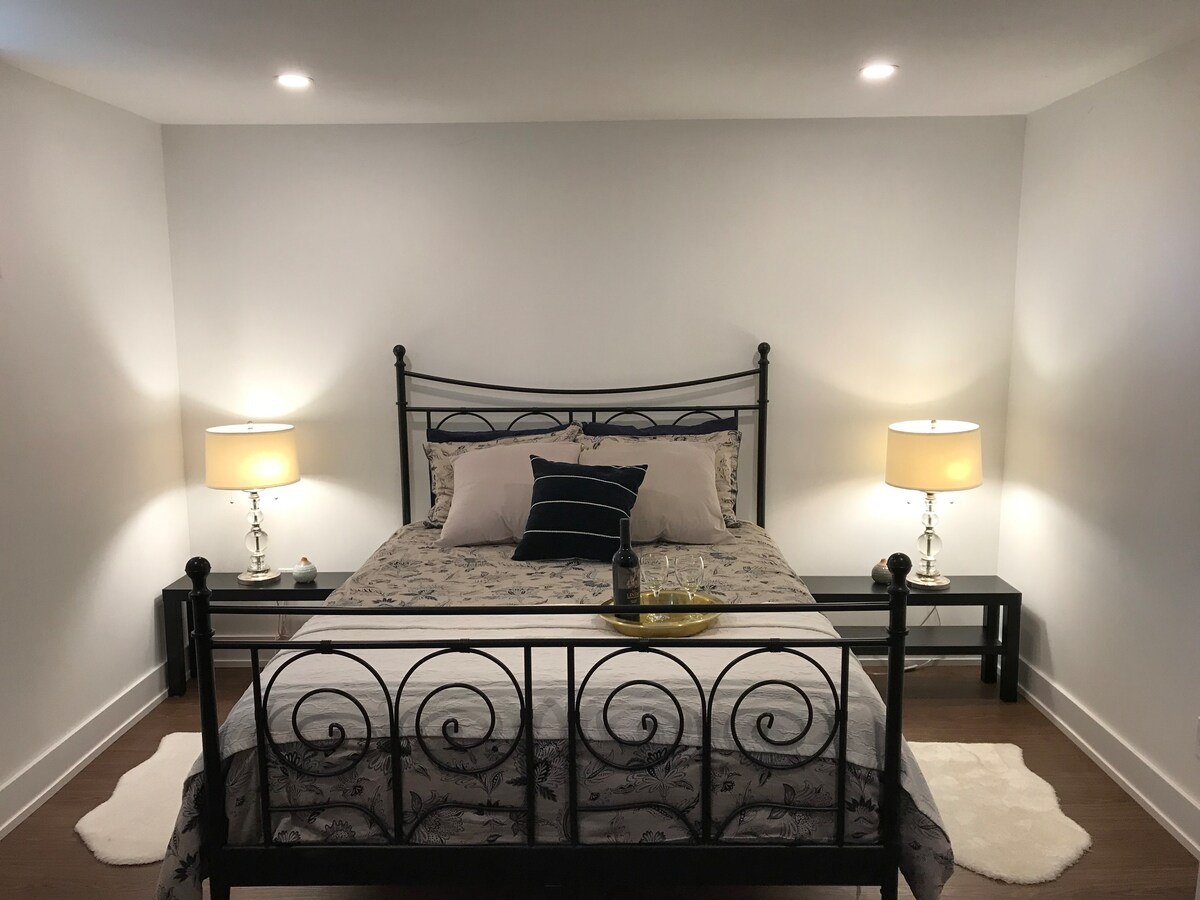 전용 출입구가 있는 현대적이고 아늑한 휴양지 — 평화로운 5성급 숙박을 원하는 커플이나 나홀로 여행자에게 적합합니다. 조용하고 편안한 휴식을 취할 수 있도록 방음 처리가 된 공간을 만들었으며, 게스트들은 깨끗하고 차분하며 따뜻한 느낌을 받는다고 자주 말합니다. 고요한 막다른 골목에 위치해 있지만 모든 것에 가깝습니다. 주요 특징 • YYZ까지 15/20분, 스퀘어 1 쇼핑까지 5분. • 토론토까지 30분, 나이아가라 폭포까지 1시간. • 내부 및 외부에서 정원 전망. • 진입로 주차 공간 1개.