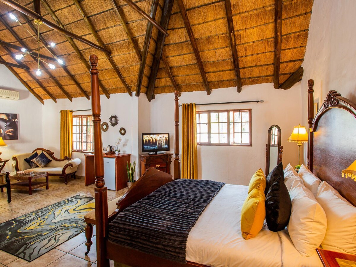 Features a spacious king bed offering crisp clean white linen, king pillows for extra comfort and fresh towels. The room also features a seating area, flat screen TV with select DStv-bouquet,Coffee&Tea tray,Bar-fridge,air-conditioning and a private patio.
