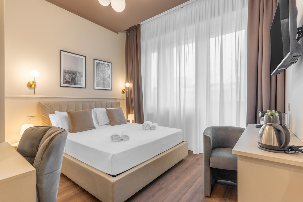 Our Double Suite welcomes you with modern style and unparalleled historic views. Equipped with a TV and desk, to meet your every need. The lovely private bathroom in the room, is an oasis of relaxation. The private terrace offers a breathtaking view of the Columns of San Lorenzo and the Basilica, allowing you to immerse yourself in Milan's rich history. This space is ideal for relaxing and admiring the city.