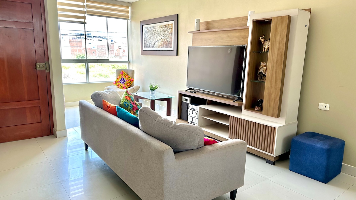 ✨ Acogedor y amplio departamento en Chiclayo – A solo 5 min del aeropuerto ✨ Disfruta de una estadía cómoda y tranquila en este espacioso departamento ubicado en la Residencial Jockey, una de las zonas más seguras y estratégicas de Chiclayo. Ideal para viajes en familia, por trabajo o turismo, con acceso rápido a todo lo que necesitas (mercado, minimarket, transporte público, etc). Nuestra prioridad es brindarte una atención cálida y personalizada.✨