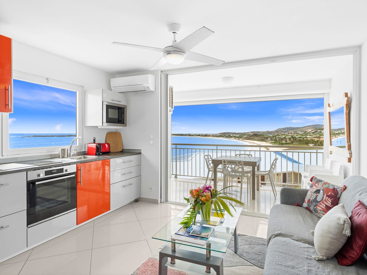 Ce studio rénové en 2024, situé en bord de mer à Saint-Martin, offre une vue panoramique directement sur la Baie Orientale sans bâtiment en avant. * Profitez de la plage à quelques pas, * Accès à la grande piscine privée * Balcon privé * Air conditionné, grand lit king, sofa-lit * Wi-Fi 1 Gb/s, * TV 4K * Intérieur moderne comprend une grande cuisine complète avec four (électros Bosch) * Machine à laver et plus Profitez de la mer, du soleil et de la tranquillité dans ce cadre idyllique!