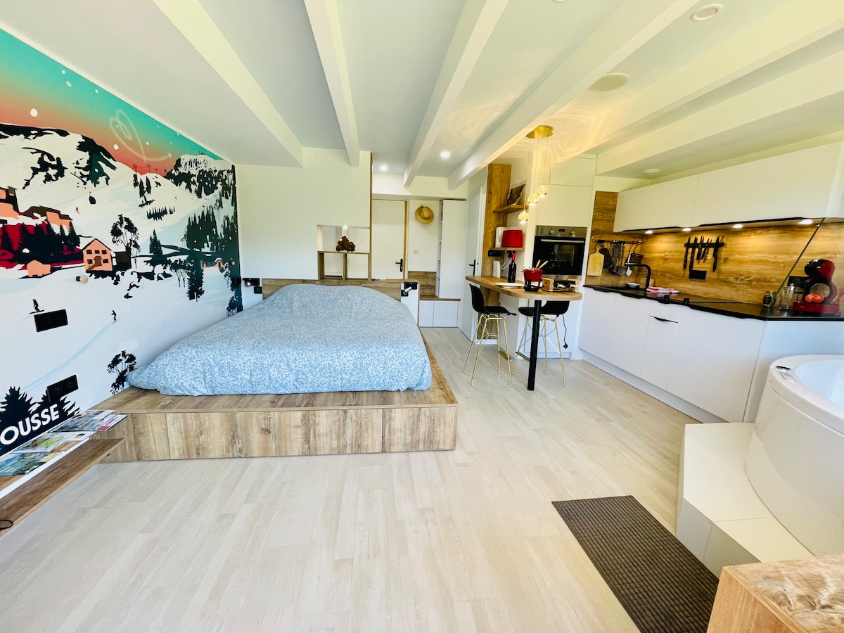 Une vue panoramique époustouflante sur les montagnes depuis le balcon, une pièce à vivre tout bois, grande hauteur sous plafond, une atmosphère qui invite à la détente... Le balcon s’ouvre sur un terrain en pente bordé par un ruisseau, discret selon la saison avec en fond sonore, le charme discret des clarines. Une immersion nature totale. Chambre intime, parking, accès facile toute saison, local matériels. Draps, serviettes, TV, internet fibre. Check-in libre. Idéal pour un duo en sérénité !