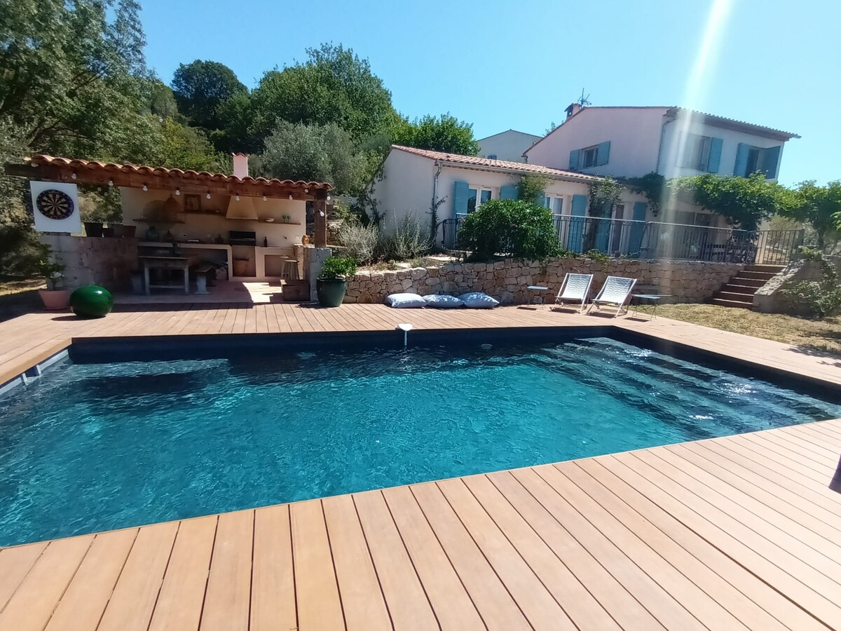 Maison de 2017 dans quartier calme proche du lac de St Cassien. Sur Terrain de 2100m² non clôturé. Grand espace de vie de 55 m². 2 chambres avec lit 140 cm donnant au sud sur la terrasse. 1 chambre enfant avec lit 140cm, 1 suite parentale ( lit 160cm ) avec salle de bain donnant au sud sur la terrasse. Climatisation partout. Piscine avec pool house et barbecue. Grande terrasse dont 25m² ombragé sous la tonnelle Possibilité de garer plusieurs voitures devant la maison. Salle de sport.
