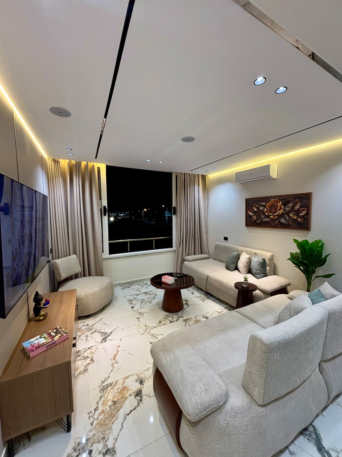 6층에 위치한 바다 전망이 좋은 아파트이며, 엘리베이터가 있고, 아파트는 넓은 리셉션과 2개의 욕실 외에도 2개의 객실로 구성되어 있으며, 아파트는 에어컨이 완비되어 있고, 와이파이와 뜨거운 물과 세탁기와 스토브와 냉장고와 전자레인지와 믹서기가 있는 주방이 완비되어 있으며, 다리미와 다리미판과 체스와 도미노와 카드와 같은 엔터테인먼트가 있으며, 가격에는 전기 및 인터넷 사용료가 포함되어 있으며, 이 아파트는 가족에게만 임대됩니다.
