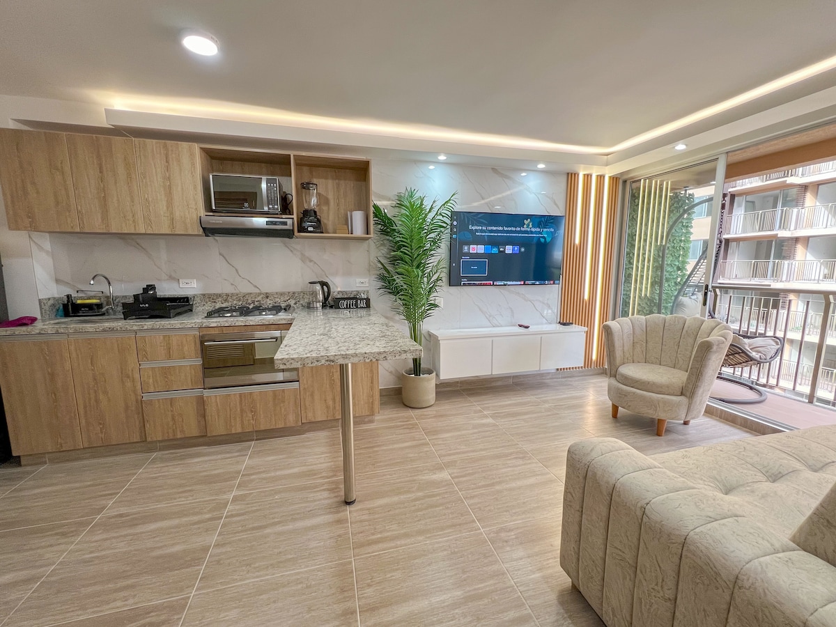 자연으로 둘러싸인 감각적이고 우아한 아파트 솔; 쾌적한 숙박을 위해 완비되어 있습니다. 신선하고 아늑한 디자인의 흠 잡을 데 없는 새로운 장소를 즐길 수 있습니다. 24시간 보안 시스템. 공항에서 5분, 파르케 델 카페에서 20분 거리에 있습니다. 리조트 유형 편의 시설: 수영장 3개, 미끄럼틀, 어린이 놀이, 자쿠지, 바비큐, 세탁기. 커피 산지 전체와 도시(페레이라 1시간 30분, 칼리 2시간 30분)를 둘러볼 수 있는 전략적인 위치에 있습니다.