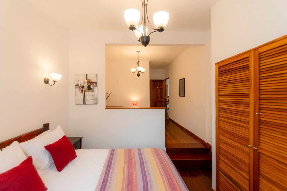 Habitación doble cómoda y luminosa ubicada en la planta baja, con baño privado. Disfruta su pared de piedra única y un escritorio funcional. Ideal para descansar en un barrio tranquilo. Esta habitacion es igual de linda y cómoda; es más económica porque no cuenta con aire acondicionado y esta en planta baja lo cual puede llegar a ser ligeramente más ruidosa. Su gran ventana da a uno de los parqueos, favorable para cuidar tu vehiculo. Acceso y baño adaptado para discapacitados.