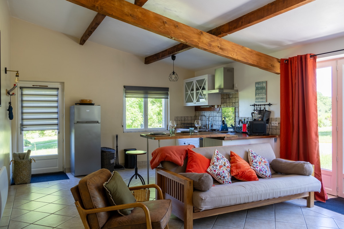 아름다운 경치를 감상할 수 있는 매력적인 석조 주택입니다. 도르도뉴 강이 내려다보이는 녹색 시골의 석양을 감상할 수 있습니다. 오래된 양 포장에 멋진 취향과 개성을 갖춘 개조된 전원주택입니다. 개방형 주방, 현대적인 욕실, 넓은 테라스, 침실 2개. 겨울철에는 장작 난로가 전원주택을 좋은 온도로 유지하는 데 도움이 됩니다. 겨울을 즐겁게 보낼 수 있는 쾌적한 분위기. (객실 내 전기 라디에이터 & sdb)