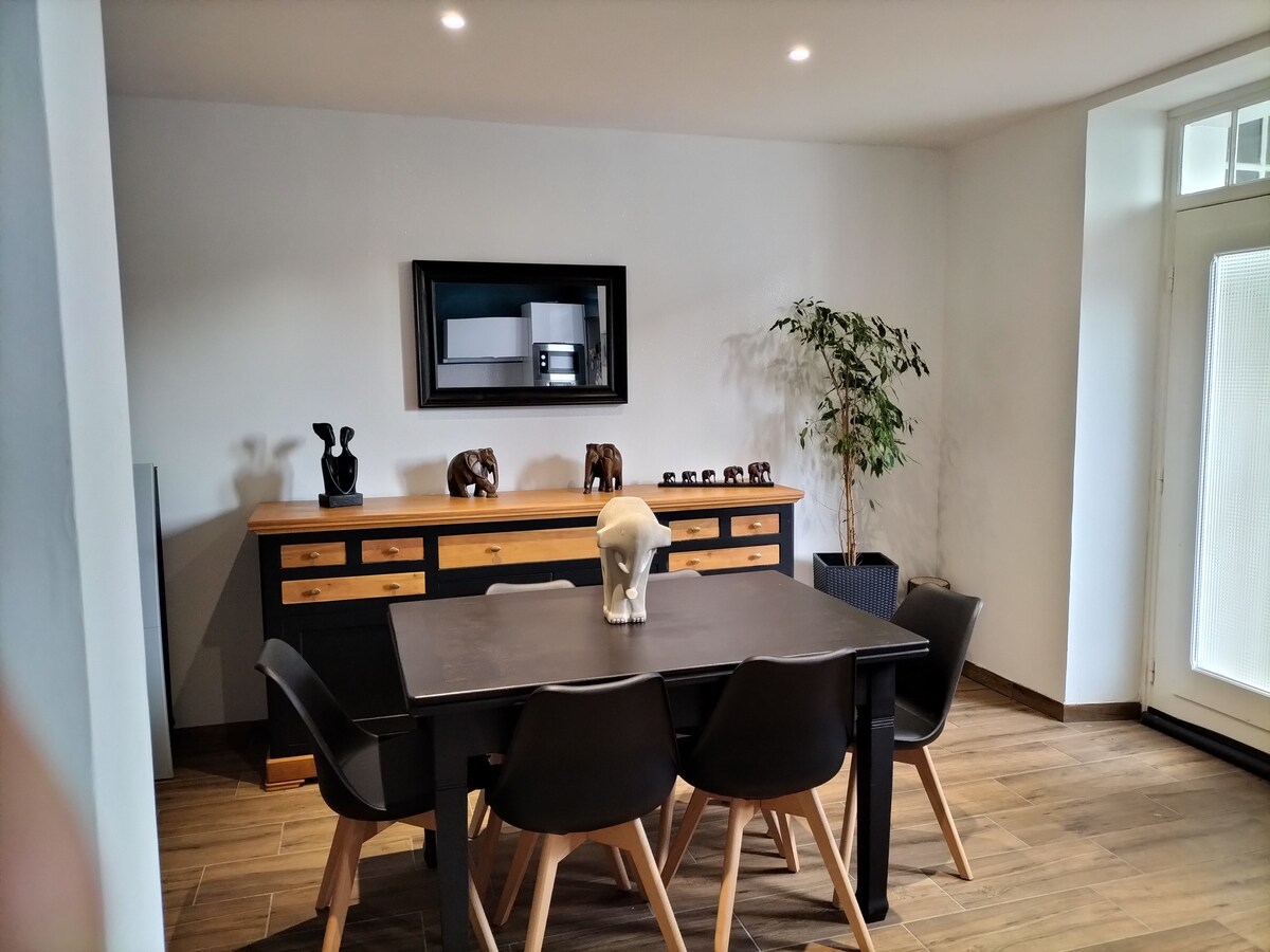 라그레인지드게우는 매력적인 95m2 전원주택으로, 모두 개조된 헛간입니다. 샤워기가 있는 자쿠지와 사우나, 개인실 1개 위층에는 킹사이즈 침대(180)가 있는 매우 넓은 22m2 침실 1개 휴식용 그물 1개. 대형 드레스룸 1개 샤워실 1개 화장실 1개, 거실 1개, 무료 와이파이, 대형 소파, 완비된 주방, 펠릿 스토브, 전용 테라스 1개(정원 테이블과 선라운지). 이 전원주택은 2세에서 17세 사이의 어린이 동반에 적합하지 않습니다.