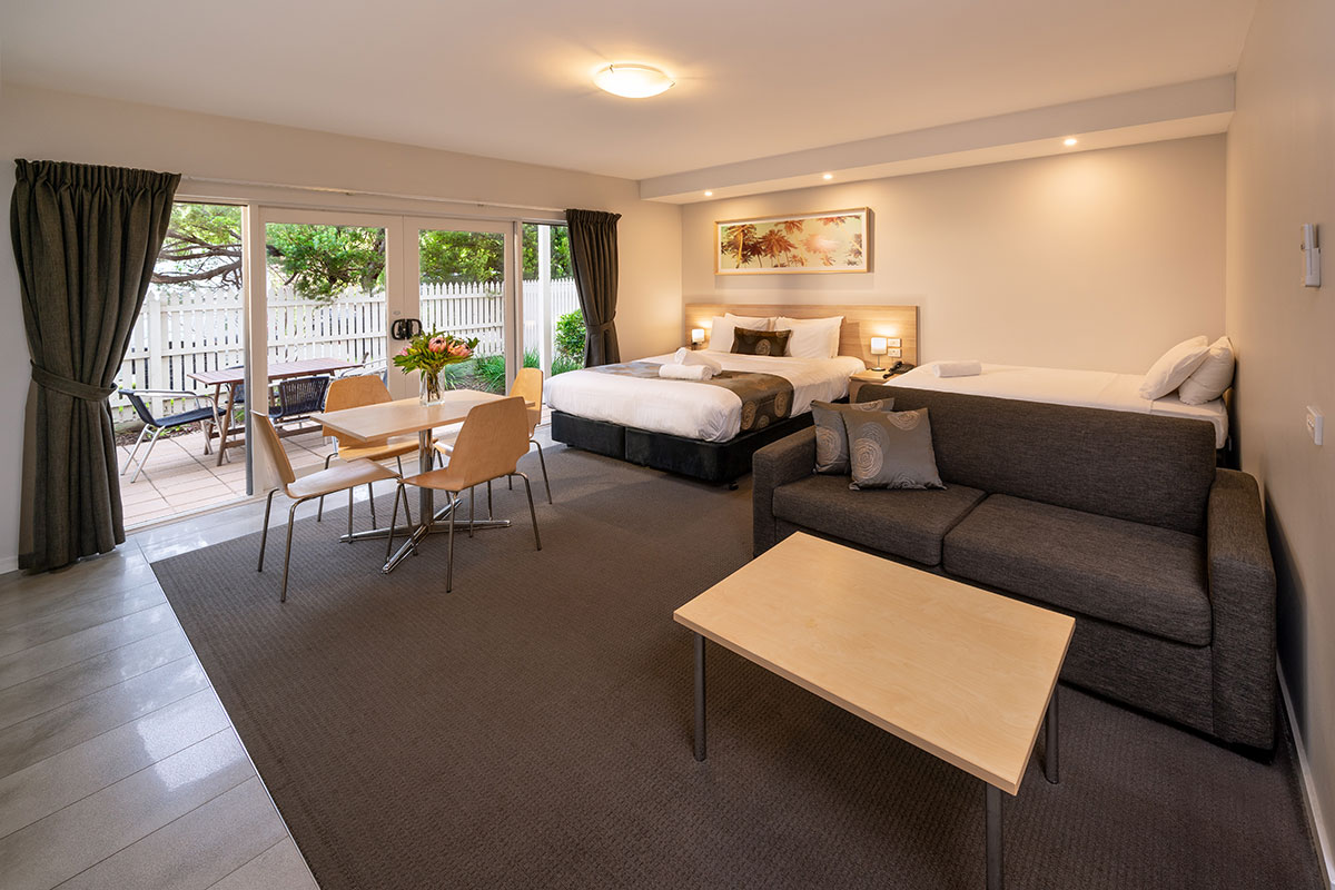 Our GARDEN FAMILY STUDIOS are beautiful, spacious, and feature private garden courtyards with outdoor settings. The ensuite offers a large walk-in shower, vanity and all bathroom amenities including a hair dryer. Rooms consist of 1 x king bed and set of bunks OR 1 x king bed and 2 single beds. Please specify which bedding arrangements you prefer.