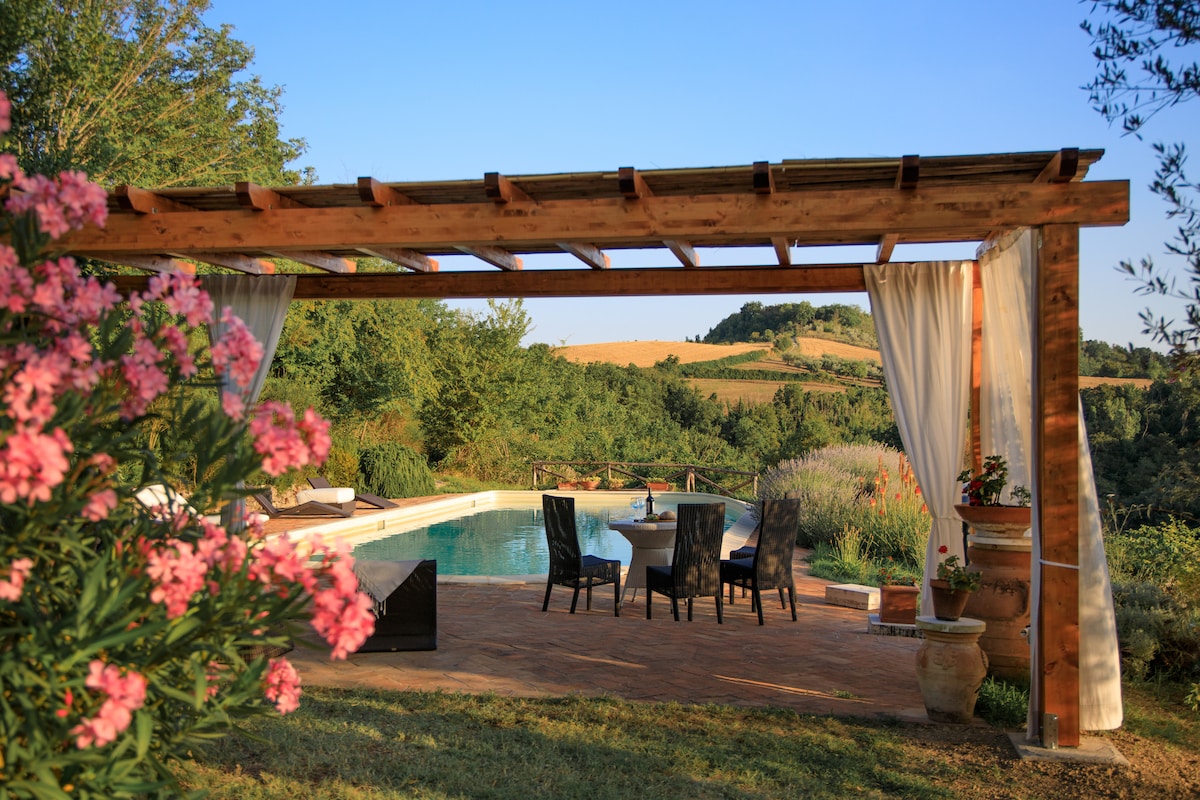 언덕 위의 매혹적이고 독점적인 10에이커의 부지, 기억에 남는 일몰, 라벤더와 로즈마리로 둘러싸인 대형 수영장, 연중 무휴. 새로운 에어컨, 스타링크 인터넷. 매우 프라이빗하고 평화로운 2층, 침실 4개, 욕실 4개, 자쿠지 욕조, 55인치 스마트TV, 잘 갖춰진 주방, 야외 식사용 베란다 및 퍼걸러, 웨버 바베큐, 피자 오븐, 올리브 숲, 벽난로 오르비에토, 토디, 아멜리아까지 20분, 로마/피렌체까지 기차역까지 차로 10분, 시내 상점까지 차로 5분. 부지/수영장 관리인