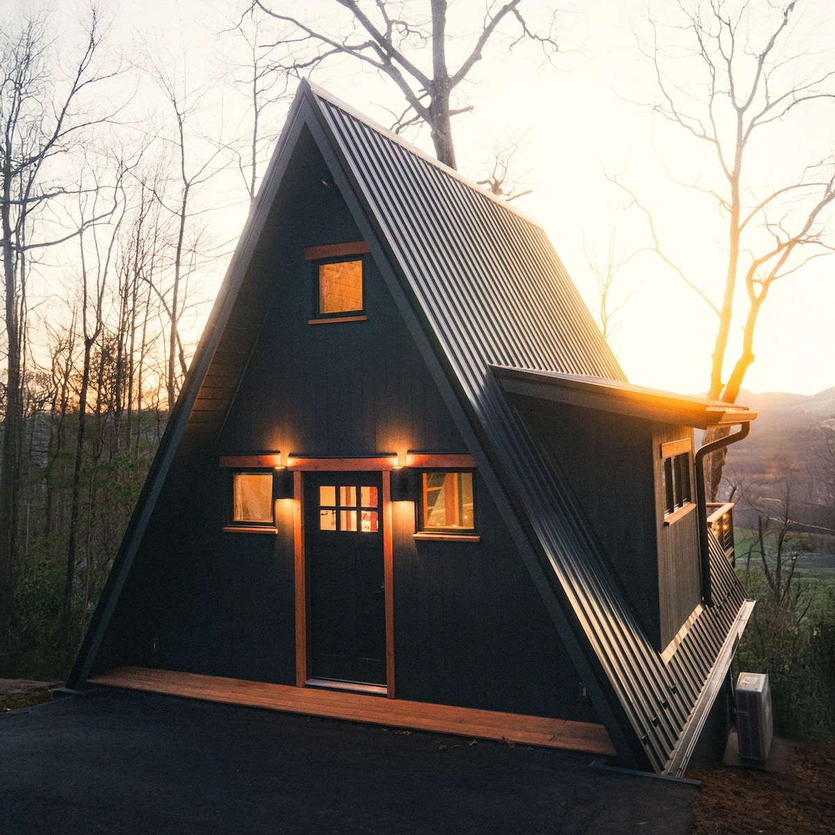 *4x4 or AWD only* Escape to our tiny modern off grid cabin situated in the middle of our private 125 acre mountain top forestry management land which backs up to Pisgah National Forest. Wake up to soaring mountain views, hike all day on the Blue Ridge Parkway, grill out and make S'mores over the fire pit, and then roll open the glass garage door to fall asleep under the stars in a comfy bed...just 25 minutes to downtown Asheville! Heated by a wood stove. All pets are welcome!.
