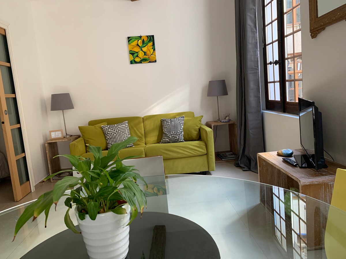 L'appartement est au premier étage côté rue piétonne et au rez de chaussée côté patio commun, constitué d'une cuisine moderne toute équipée ouverte sur le salon-salle à manger comprenant un canapé lit deux places, une chambre avec lit en 160. L’appartement dispose de la climatisation