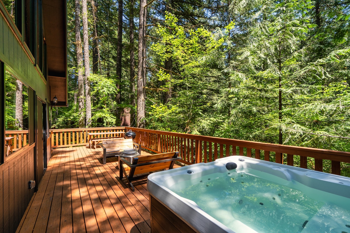 Time to relax at this peaceful woodland cedar cabin retreat! This 2 bd/2bth home also includes a 2-person sleeper sofa & bonus sleeping loft for 2. A relaxing get away in the woods. Wy’east cabin provides a unique experience that includes a private deck, hot tub & fire pit. River only a two minute walk down the road! Spend the day hiking or skiing the nearby slopes! In the evening you’ll be able to let your worries slip away, as you warm those soar muscles in a hot tub. STR# 828-22