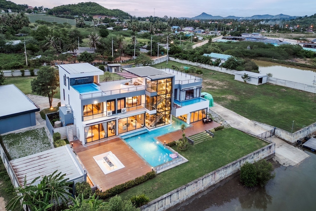 • 숙소는 야외 공간, 넓은 앞마당이 있는 바닷가에 있습니다. • 아름다운 해변 앞 집, 깨끗하고 평화로우며 물속에서 놀 수 있습니다. • 180도 바다 전망을 감상할 수 있는 2층 파노라마 전망 수영장. • 침실에서 바로 보이는 바다 전망 모든 주방용품을 갖춘 주방용 주방 1개 사운드 시스템과 노래방 마이크 2개가 있는 거실 1개 바비큐 그릴 및 야외 좌석 공간 카약을 무료로 이용하실 수 있습니다. * 식기세척기, 오븐, 커피메이커가 없습니다. 주차가 편리하게 가능합니다. Villa Beachfront Kuiburi
