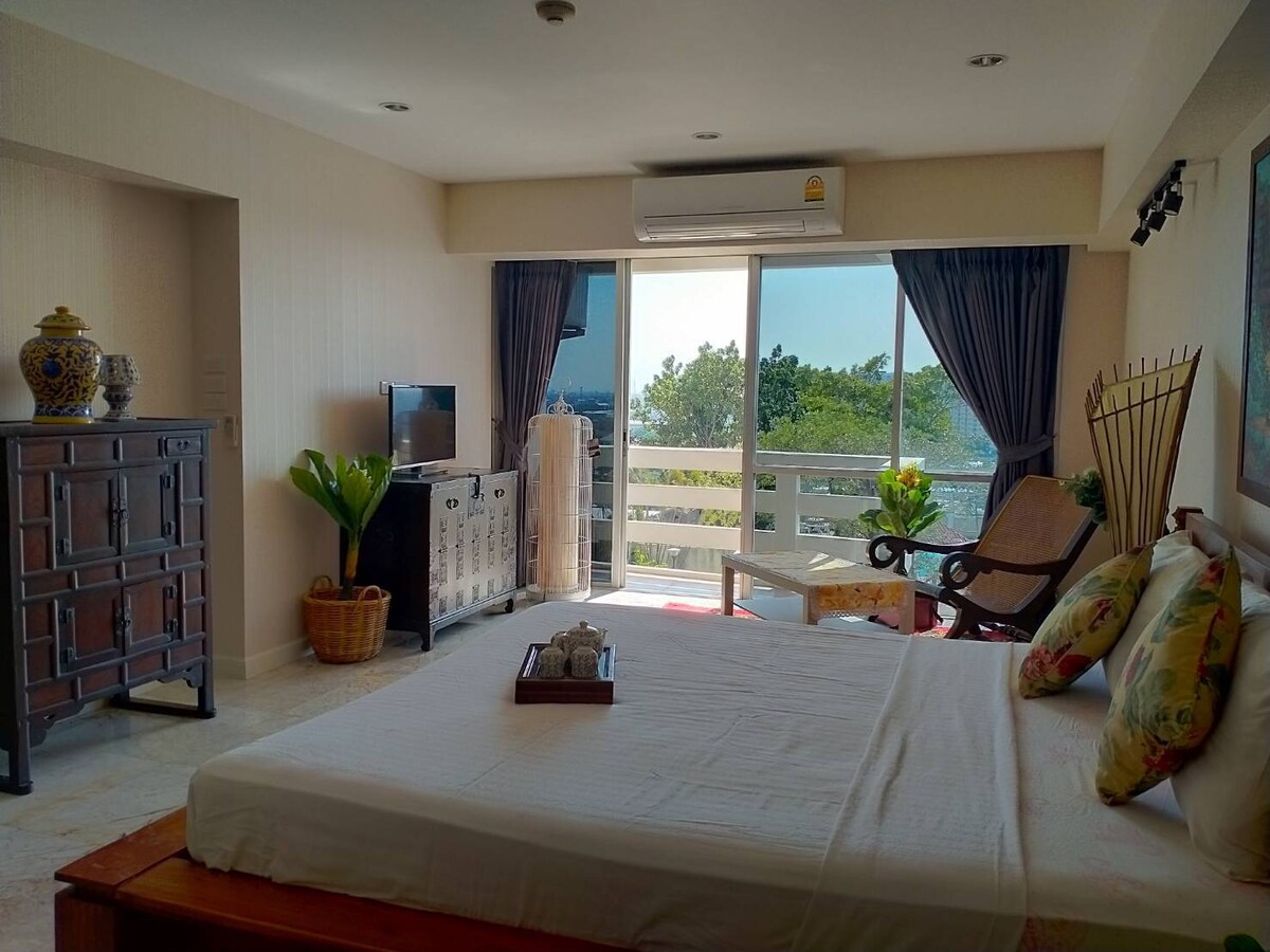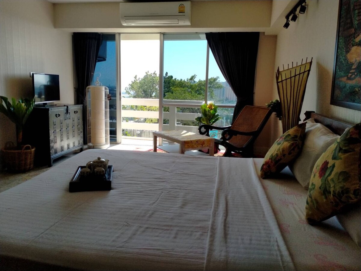Big studio apartment with an oriental touch decor. Big balcony with good breeze all day. Garden and pool view.Well equiped with western equipments , kitchen stove and tools. Excellent mattress and fine linen. Hot shower and good water pressure . Apartment size is very good for a long term stay and super good for a short term as well. Chair in the living area was replaced with soft sofa for a more comfortable seating. If you prefer a chair as seen in photos , we can bring to the room for you.
