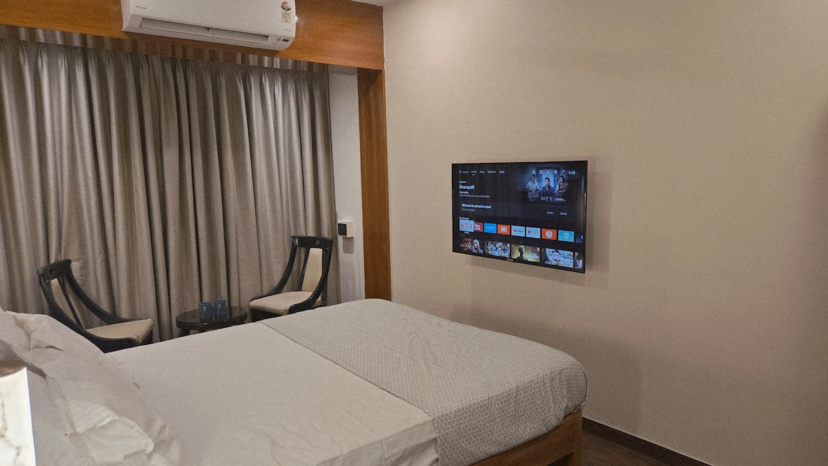 아늑한 침실, 욕실 2개(침실에 딸린 욕실 1개, 공용 욕실 1개), 가전제품과 기본 조리도구가 완비된 실용적인 주방을 갖춘 가구가 완비된 1BHK 아파트에서 고급스러운 숙박을 즐기세요. 커다란 스마트 TV와 우아한 인테리어 디자인으로 넓은 거실에서 휴식을 취하세요. 내 집처럼 편안한 고급 가구를 즐겨보세요. 단기와 장기 숙박에 모두 완벽한 이 아파트는 최고의 도시 위치에서 편안함과 편리함을 약속합니다. 지금 예약하고 특별한 숙박을 경험하세요!
